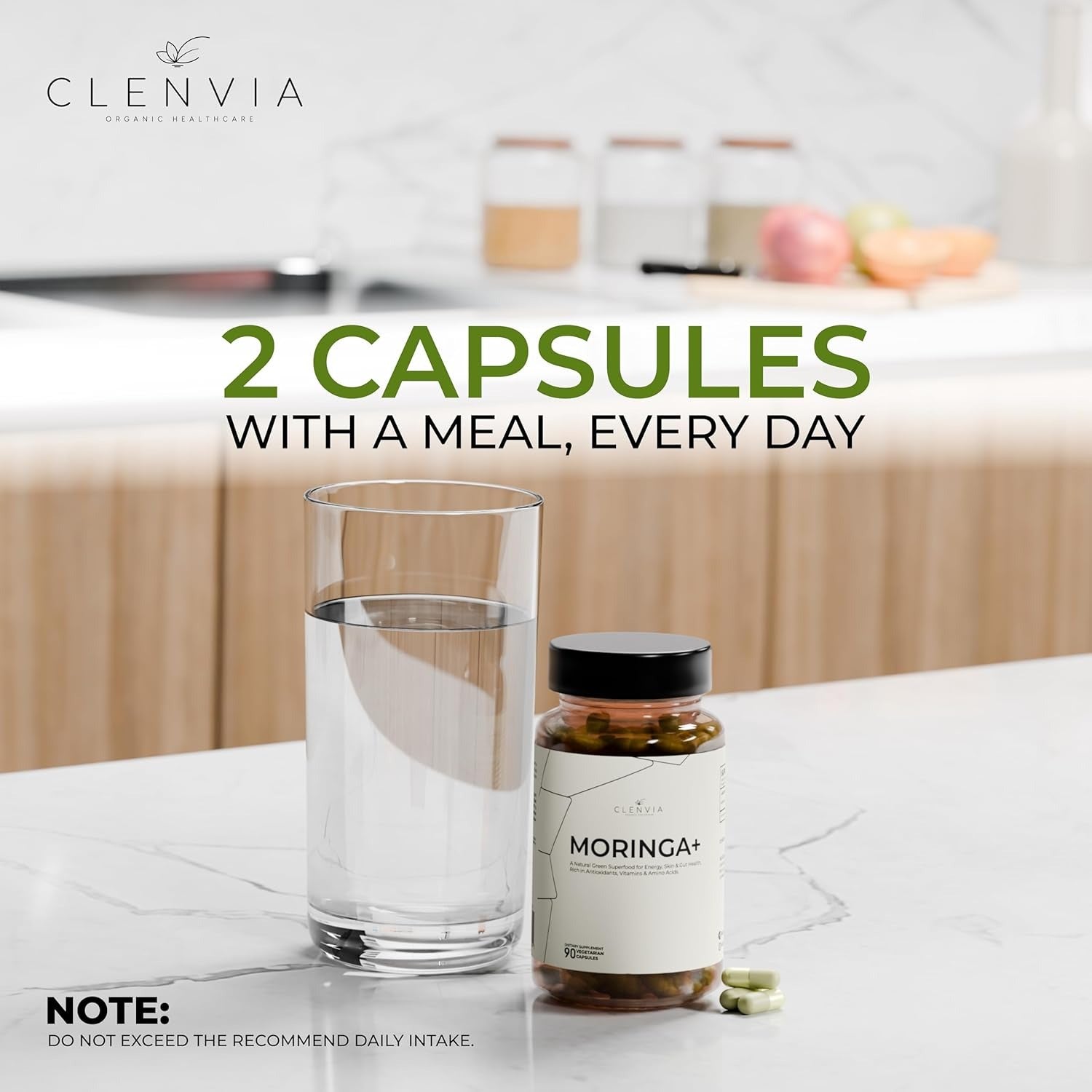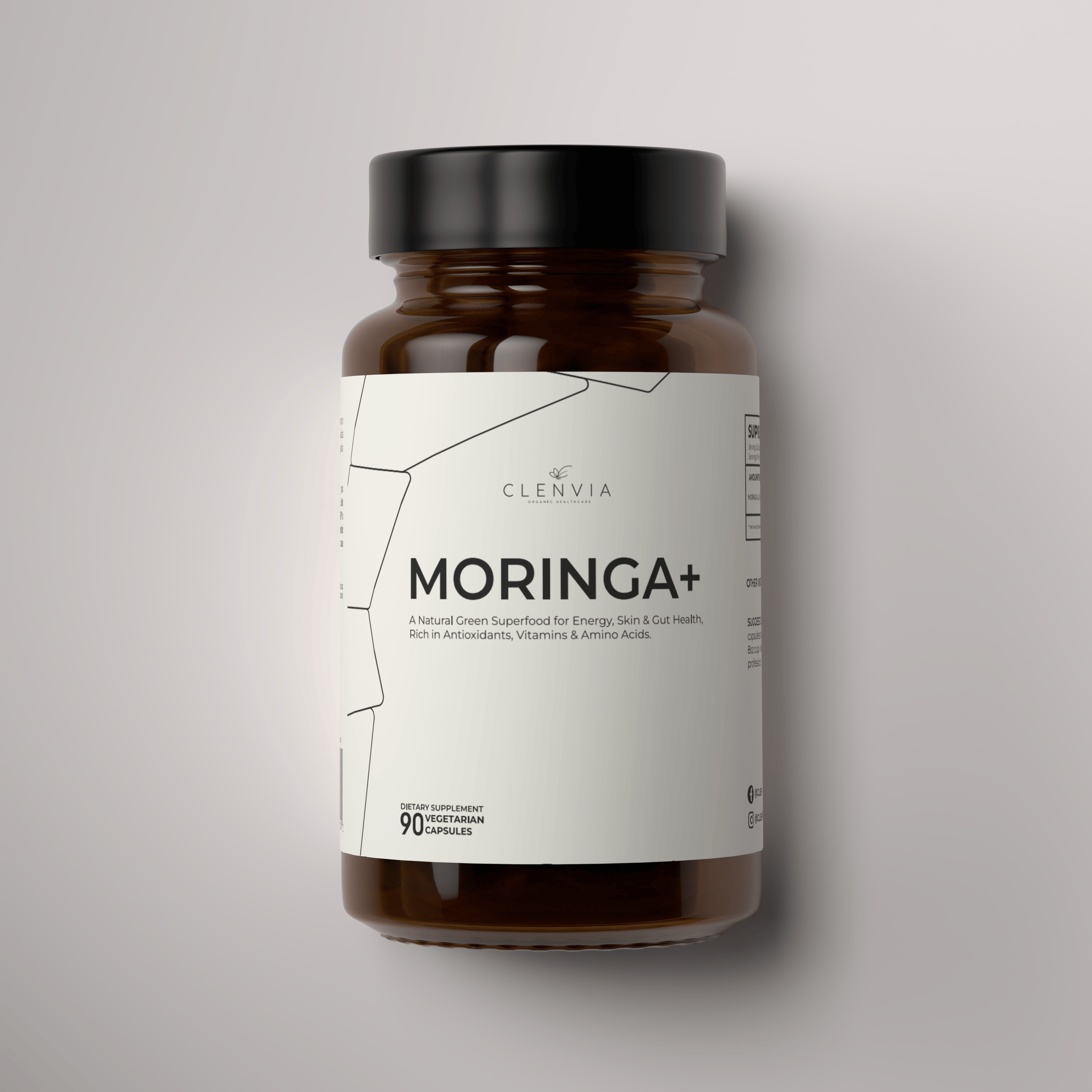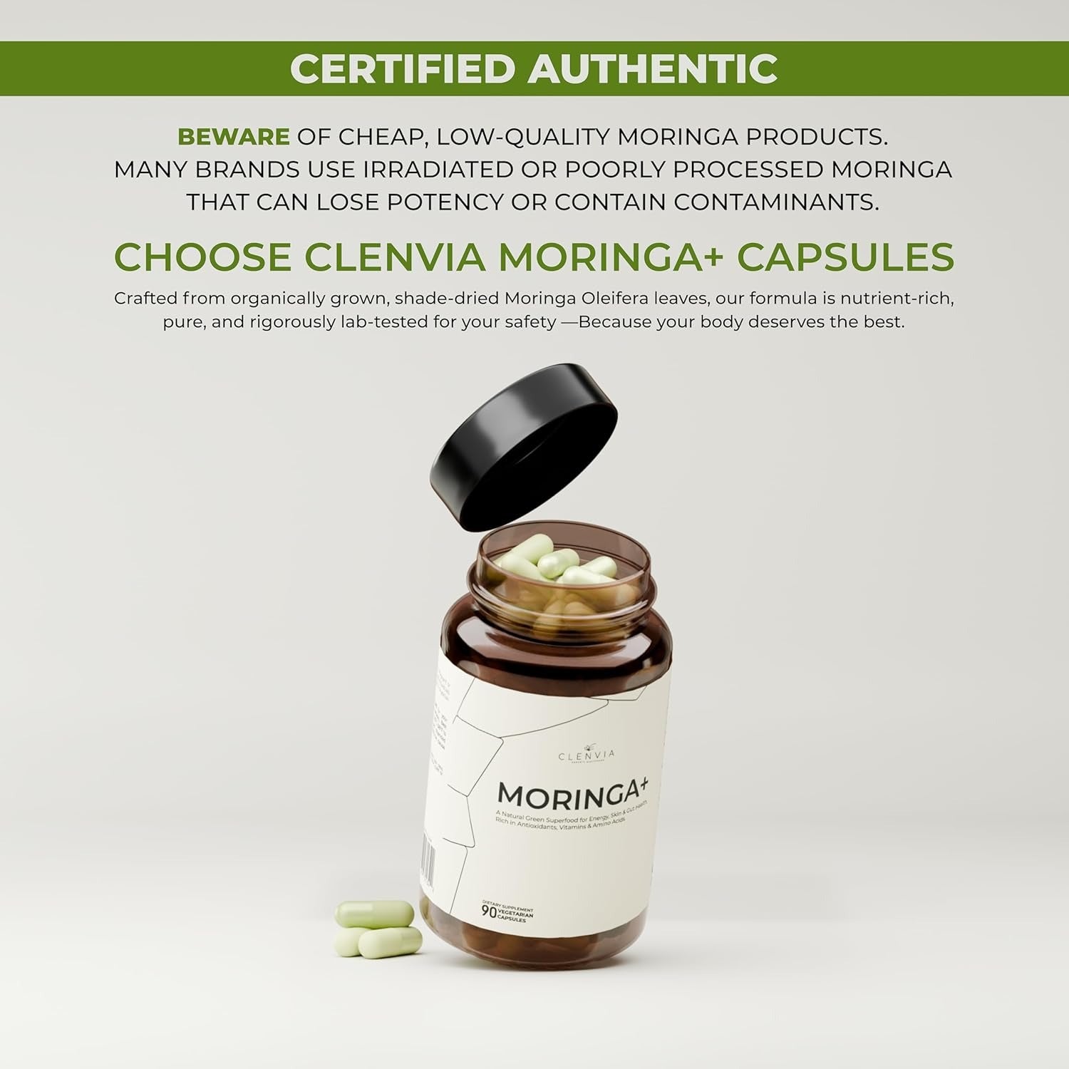 Clenvia Moringa+ Capsules deliver the power of the ultimate green superfood in a pure and potent form. Made from 100% organic moringa leaf powder extract, each serving provides 1000mg of nutrient-rich support for daily energy, immunity, skin health, and digestion.