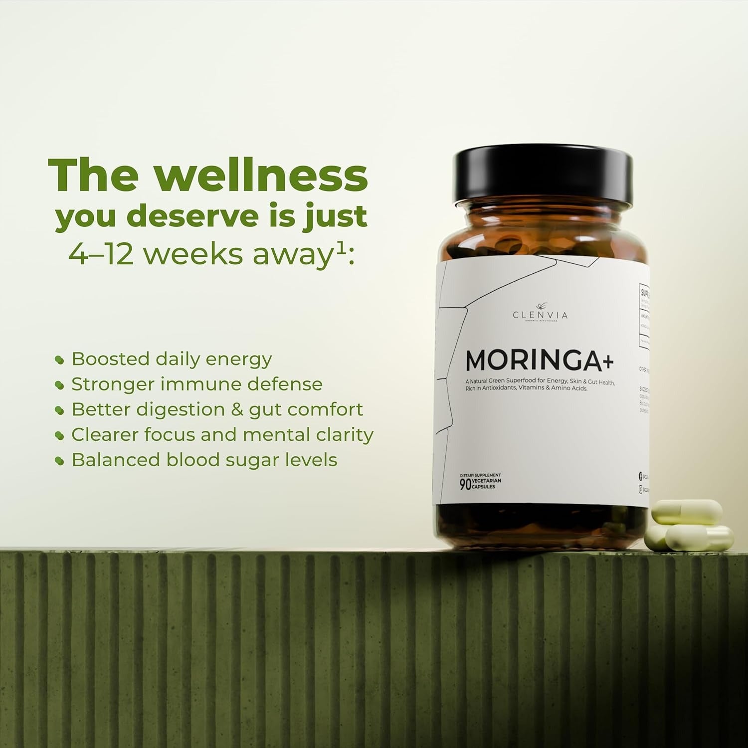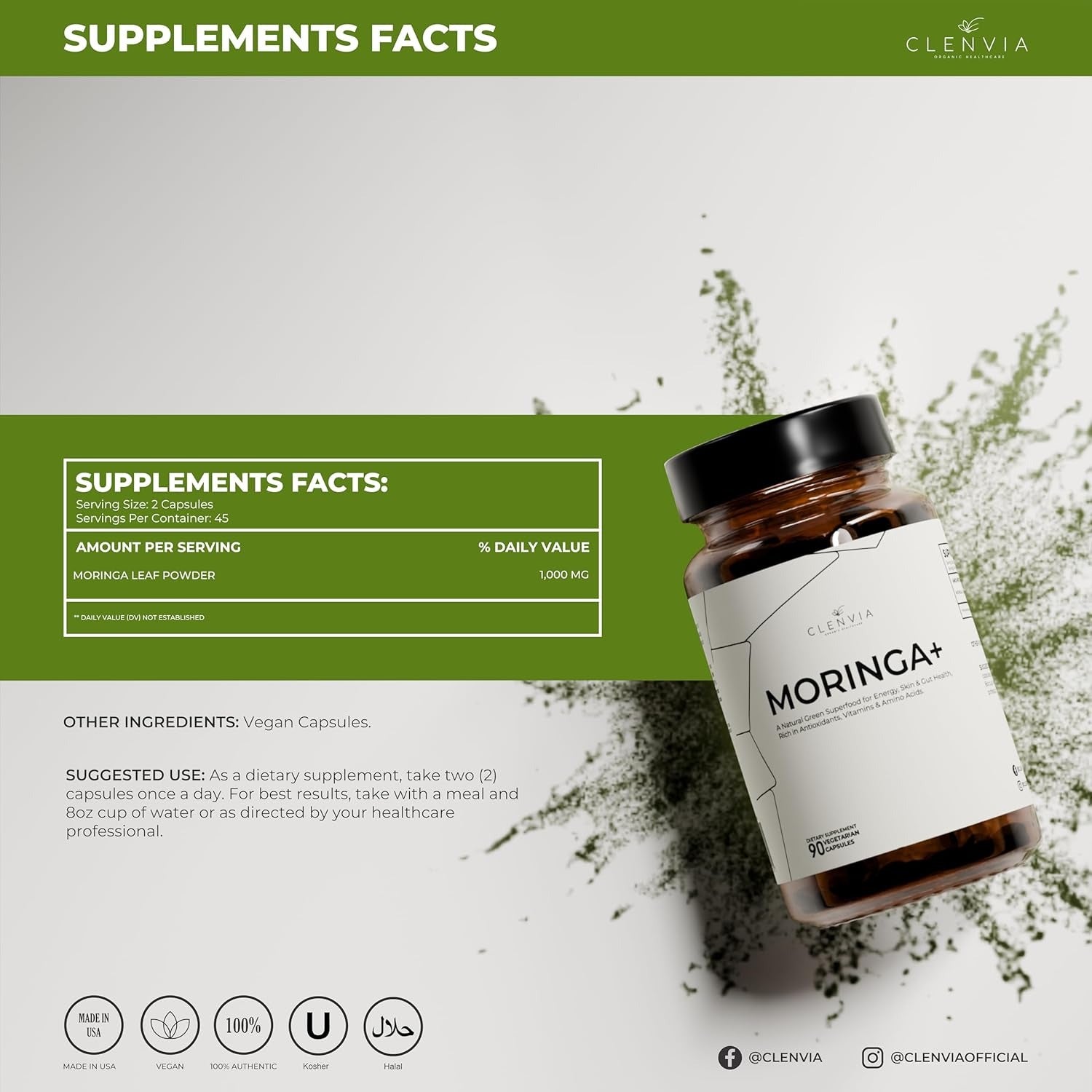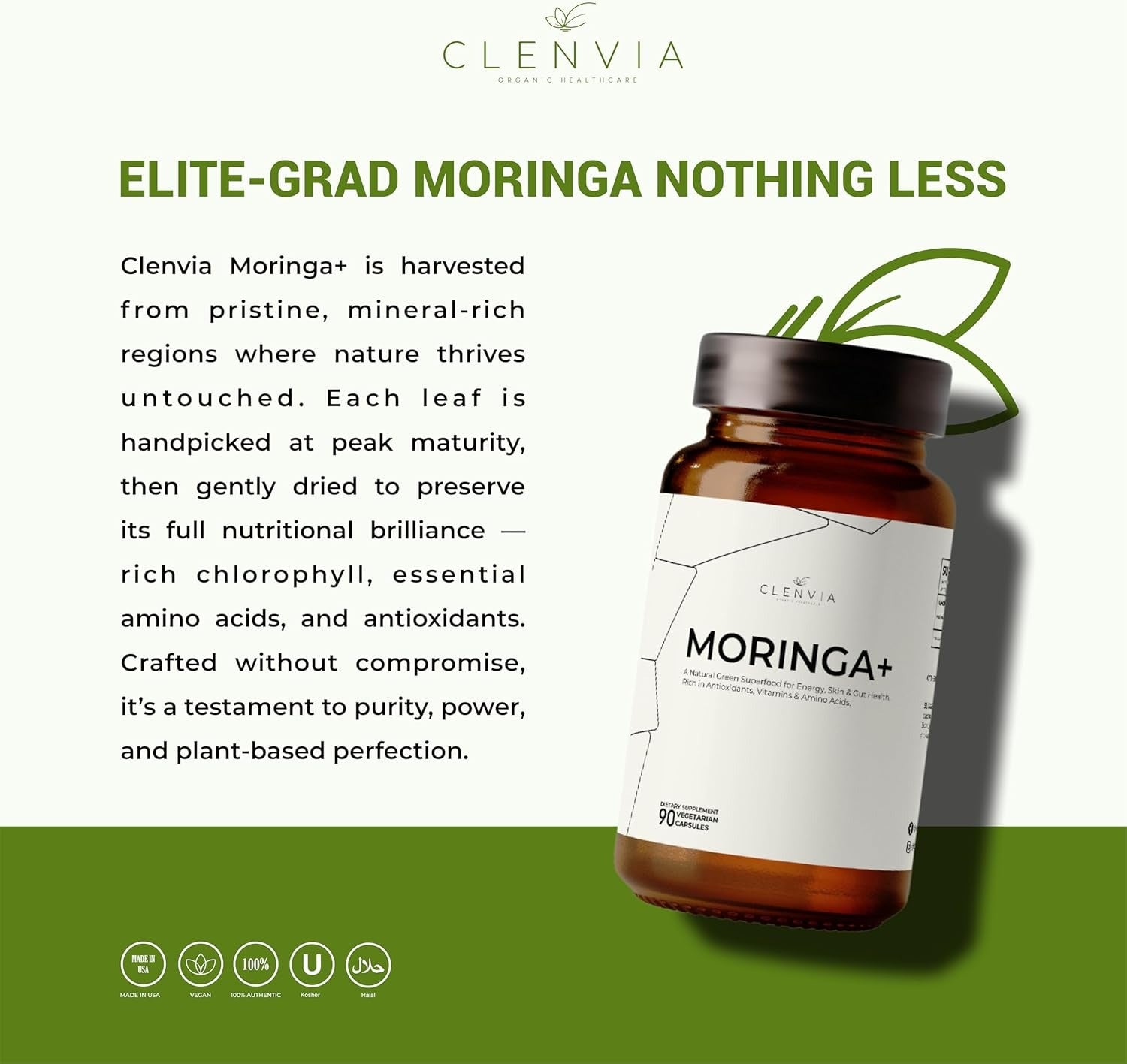 Clenvia Moringa+ Capsules deliver the power of the ultimate green superfood in a pure and potent form. Made from 100% organic moringa leaf powder extract, each serving provides 1000mg of nutrient-rich support for daily energy, immunity, skin health, and digestion.