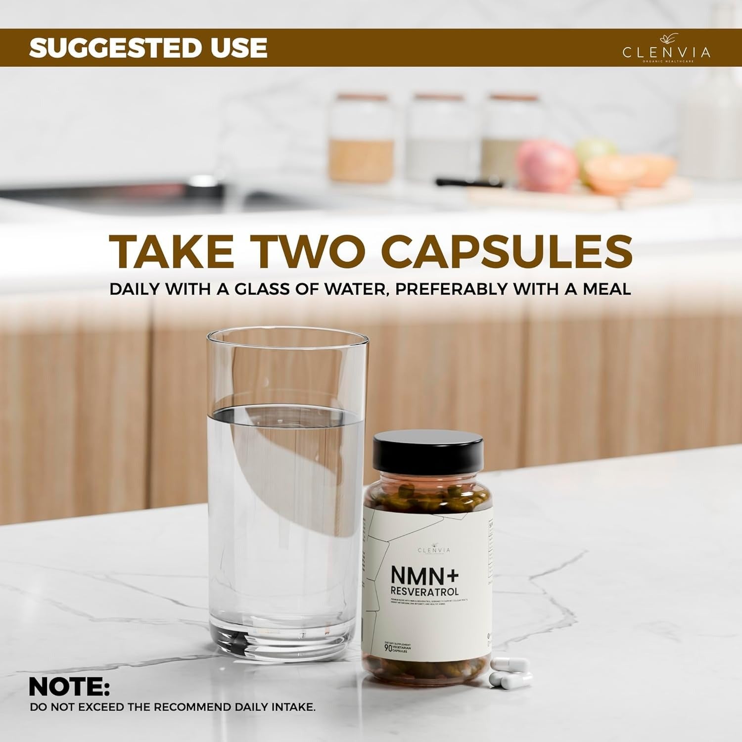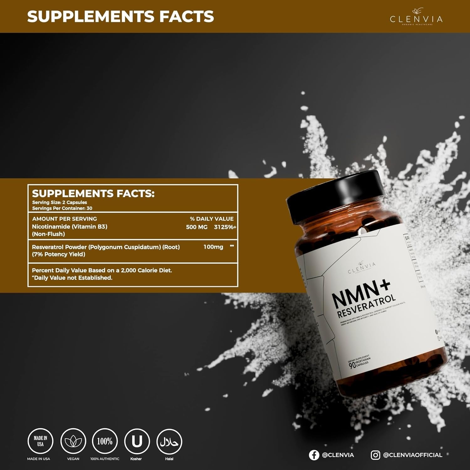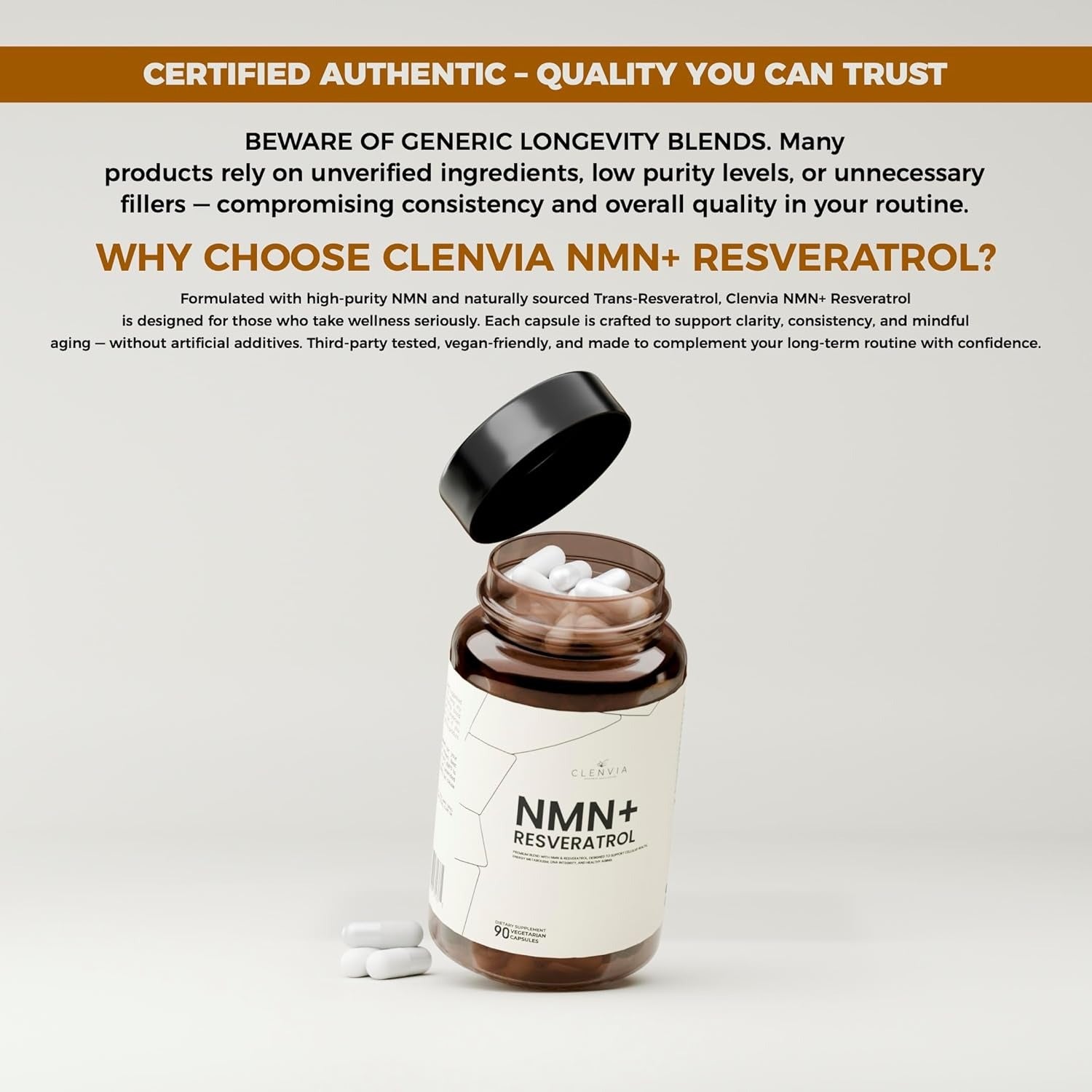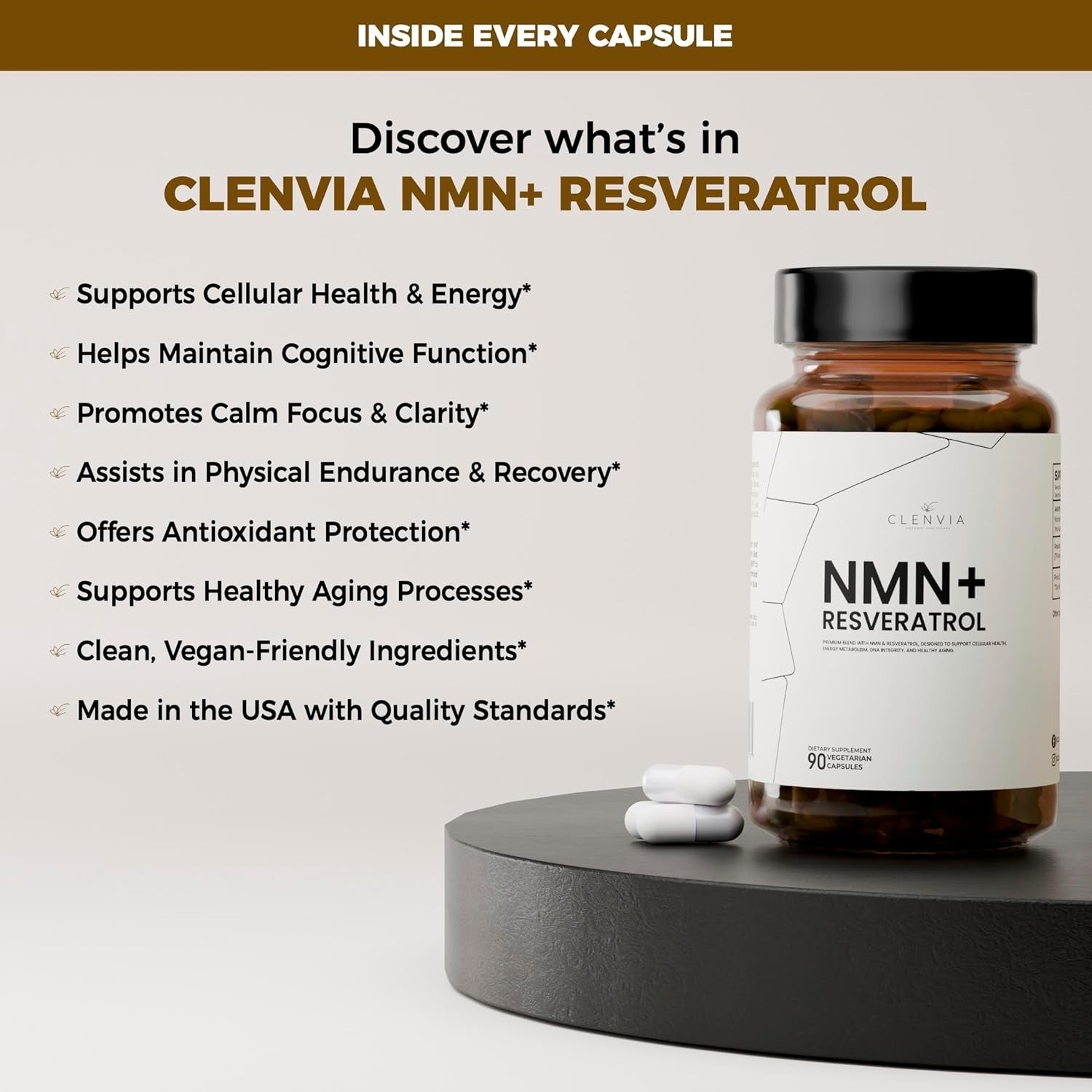 Experience next-level cellular support with Clenvia NMN+ Resveratrol, a premium longevity supplement designed to optimize NAD+ levels, support DNA repair, and enhance healthy aging. Each serving provides a powerful 500mg of NMN (Nicotinamide Mononucleotide) and 100mg of Resveratrol, two synergistic compounds backed by advanced nutraceutical science.